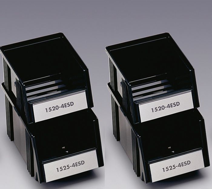 Set of 4 stacking bins^ Set of 4 stacking bins, ESD black, (2) 1525-4ESD (9.84inx5.87inx5.12in) and (2) 1520-4ESD (7.56inx5.87inx4.13in)