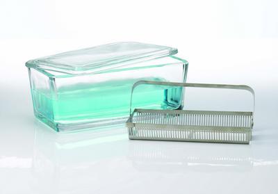 Staining Dish, 50-Slide^ Slotted rack holds 50 microscope slides, sizes 3in.x1in. (75x25mm), as well as 3in.x1 1/2in. (75x38mm) and 3in.x2in. (75x51mm). Unit measures approximately 200x83x105mm overall. Rack is made of non-tarnishable stainless steel and is resistant to most staining solutions.