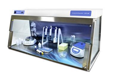 Cabinet^ Large capacity stainless steel pcr uv cabinet. It has a uv lamp installed in the hood which disinfects the working area, inactivating dna/rna. Equipped with a flow-type bactericidal uv cleaner-recirculator providing decontamination inside the cabinet. 3 internal sockets.