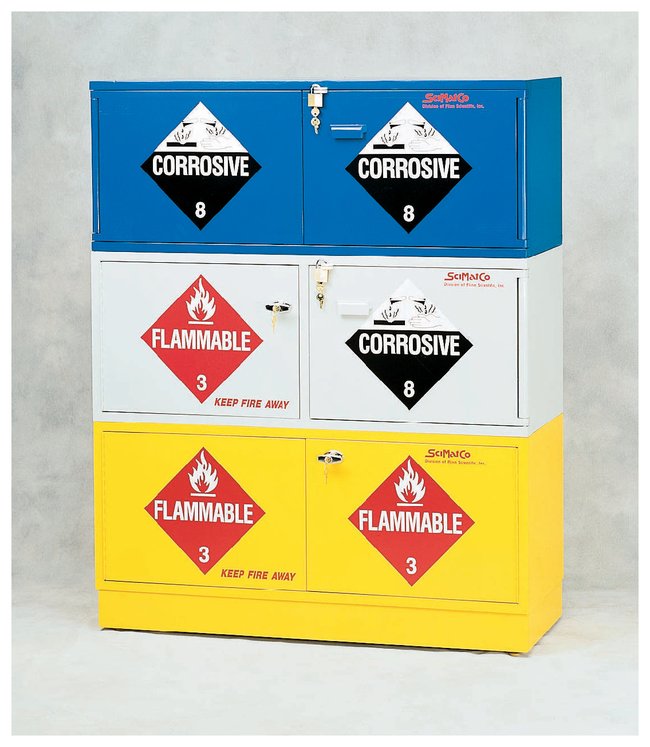 No interior metal parts to corrode: wooden hinges and handles, polypropylene lining on cabinet floor, and polypropylene padlock assembly.Lock with two keys and piano-style door hingesAll hardware is corrosion resistantLiquid-tight trough floors10 x 10 in. (25 x 25cm) Hazard labels on both doorsEpoxy paint finish inside and outCorrosives CabinetCapacity: 22 × 2.5L (approx. 14.5 gal./55L)Blue finishAccepts nitric acid compartmentFlammables CabinetCapacity: 16 × 1 gal. (approx. 60.5L)Yellow finishCombination CabinetCombination corrosives/flammables cabinetCorrosives compartment capacity: 10 × 2.5L (approx. 6.5 gal./25L)Flammables compartment capacity: 8 × 1 gal. (approx. 30L)Gray finishFloor StandsHeight: 4.5 in. (11cm)Epoxy paint finishOrder InfoInterior: 15.125D × 45W × 16 in.H (40 × 114 × 41cm)Exterior: 18L × 47W × 18 in.H (46 × 119 × 46cm)ComplianceMeet all applicable OSHA and NFPA standards.