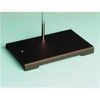 These stamped steel bases feature 2 tapped holes for the rods. Hole at the center of the shorter side is for standard ring stand use. Hole at the center of the longer side is for titrations, specific gravity determinations, etc. Each base includes a zinc plated steel rod.
