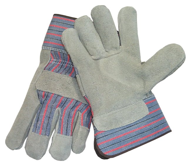 Split Cowhide Leather Palm Gloves, Gloves feature a traditional fabric striped back with a split cowhide leather palm, Dozen of 12