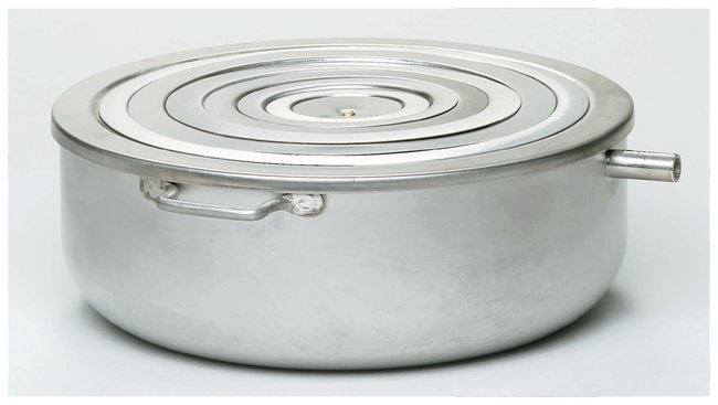 Gently heats flasks, bottles, and tubesThis small stainless steel bath is corrosion-resistant and features a shallow form with a flat bottom, beaded reinforced edges, a steam escape outlet, convenient riveted handles, and concentric ring sets. Seven rings.Order InfoMeasures 8 x 2-3/4”.