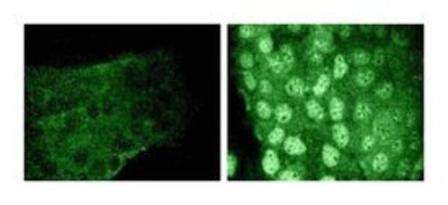 The Stat proteins function both as cytoplasmic signal transducers and as activators of transcription. Seven mammalian Stat proteins have been identified: Stat1-4, Stat5a, 5b, and Stat6. Stat3 is a 92kDa protein that is activated as a DNA binding protein through cytokines, such as IL-6, and growth factors, such as EGF. Stat3 is phophorylated at serine 727 (S727) via the MAPK pathway. The S727 residue is located at a conserved Pro-X-Ser-Pro sequence, which is recognized by the protein kinase ERK. Activation through the S727 residue is thought to lead to initiation of transcription. Upon activation, Stat3 dimerizes, translocates to the nucleus, and binds DNA response elements thereby regulating gene expression. It appears that Stat3 binds to DNA as a homodimer, but it is also capable of binding as a heterodimer with Stat1. In addition to serine phosphorylation, Stat3 is also phosphorylated at tyrosine 705 by JAK1 in response to cytokine stimulation. Stat3 is widely expressed and can bind to the sis-inducible element (SIE) site from the c-fos promoter. This site is similar to the GAS element that is present in IFN-g-induced genes. Thus, phosphorylation of S727 in Stat3 occurs in response to growth factors and cytokines, and is essential for normal transcription activity.Immunofluorescence, Western Blotting