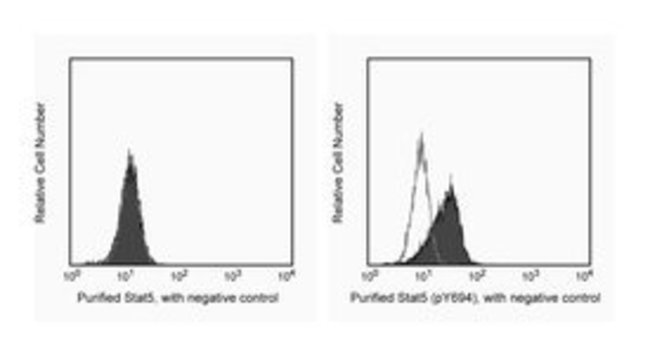 The Stat proteins function both as cytoplasmic signal transducers and as activators of transcription. Seven mammalian STATs have been identified: Stat 1-4, Stat5a, 5b, and Stat6. The SH3 domain of Stat5 shows extensive homology with the SH2 domains of Stat1 and Stat2. This homology leads to speculation that it may have a broader physiological role than originally anticipated and has led to its classification as a member of the Stat family. Stat5 has been further characterized and shown to be encoded by two separate genes, Stat5a and Stat5b that share over 90% identity at the amino acid level. Further insight into the exact biological role of Stat5a and Stat5b was determined with the generation of Stat5a and Stat5b deficient mice. Stat5a was shown to be involved in lactogenesis and mammary development, while Stat5b was shown to be involved in growth hormone signaling and to play a role in liver gene expression. Both Stat5a and Stat5b share similarities, both are involved in IL-2 induced peripheral T cell proliferation. Stat5 (MGF) mRNA expression is highest in mammary gland tissue. Lower levels are found in ovary, thymus, spleen, kidney, lung, muscle, and the adrenal gland. The peptide hormone, prolactin, binds to the prolactin receptor (PRLR) to initiate the lactogenic response. There are at least three forms of PRLR; however, only the long form is able to activate the 92kDa Stat5 protein by inducing phosphorylation at Tyr694. Once phosphorylated, Stat5 becomes an essential transcription factor which binds to the β-casein gene promoter. Stat5 activity is tightly regulated throughout gestation, lactation, and post-lactation. Treatment of activated Stat5 with a protein tyrosine phosphatase results in the loss of DNA binding activity. The presence of an SH2 domain within Stat5 suggests that it may directly interact with protein tyrosine kinases (PTKs) such as JAK2.Host Species: MouseClone: 47Isotype: IgG1, κSpecies Reactivity [for Features Main]: HumanImmunogen: Phosphorylated Sheep Stat5 PeptideIntracellular Staining, Western Blotting