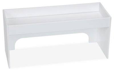 Medium Step Shelf^ 20.3cm tall. Utilizes vertical space. Designed to fit over gas and water outlets and other protrusions. Cords or wires fit through space at lower back. Dimensions: 45.7Lx15.2Dcm.