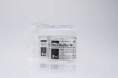 STERI-BUFFER* Sterile Phosphate Buffer^ 90mL fill volume. Filtered at 0.2u and terminally sterilized at SAL level of 1e-6. Includes no-tamper tear strip for sterility assurance. Wide-mouth bottle for easy pouring.