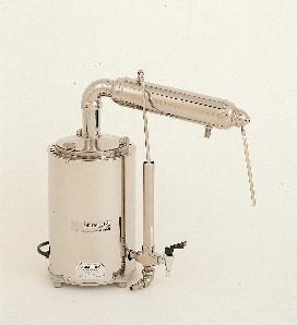 Electric Portable Still^ Produces water at 1.9L/hour. About 15L/hour required for cooling condenser and feeding evaporator. Incorporates a low water cut-off. Volatile impurities eliminated. Flexible tubing may be used. Made of copper and bronze with a coating of pure tin. 53x26x49cm. 120V, 1300W.