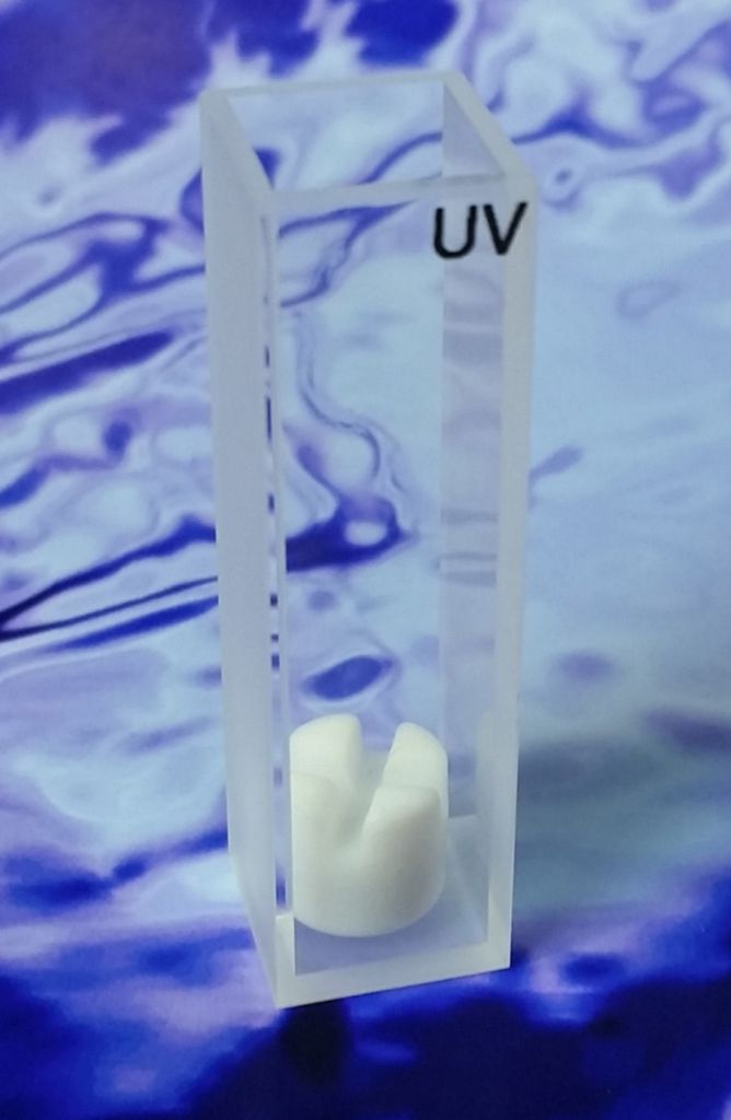 Stirrer for 10mm Cells^ Stirrer for 10mm Cells, Dimensions: 9.5mm diameter X 8mm high, Material: PTFE magnetic, the one-piece molded unit will not scratch cuvettes and has crevices to trap dirt. Action generated by the cross channels in the upper face mixers without aeration