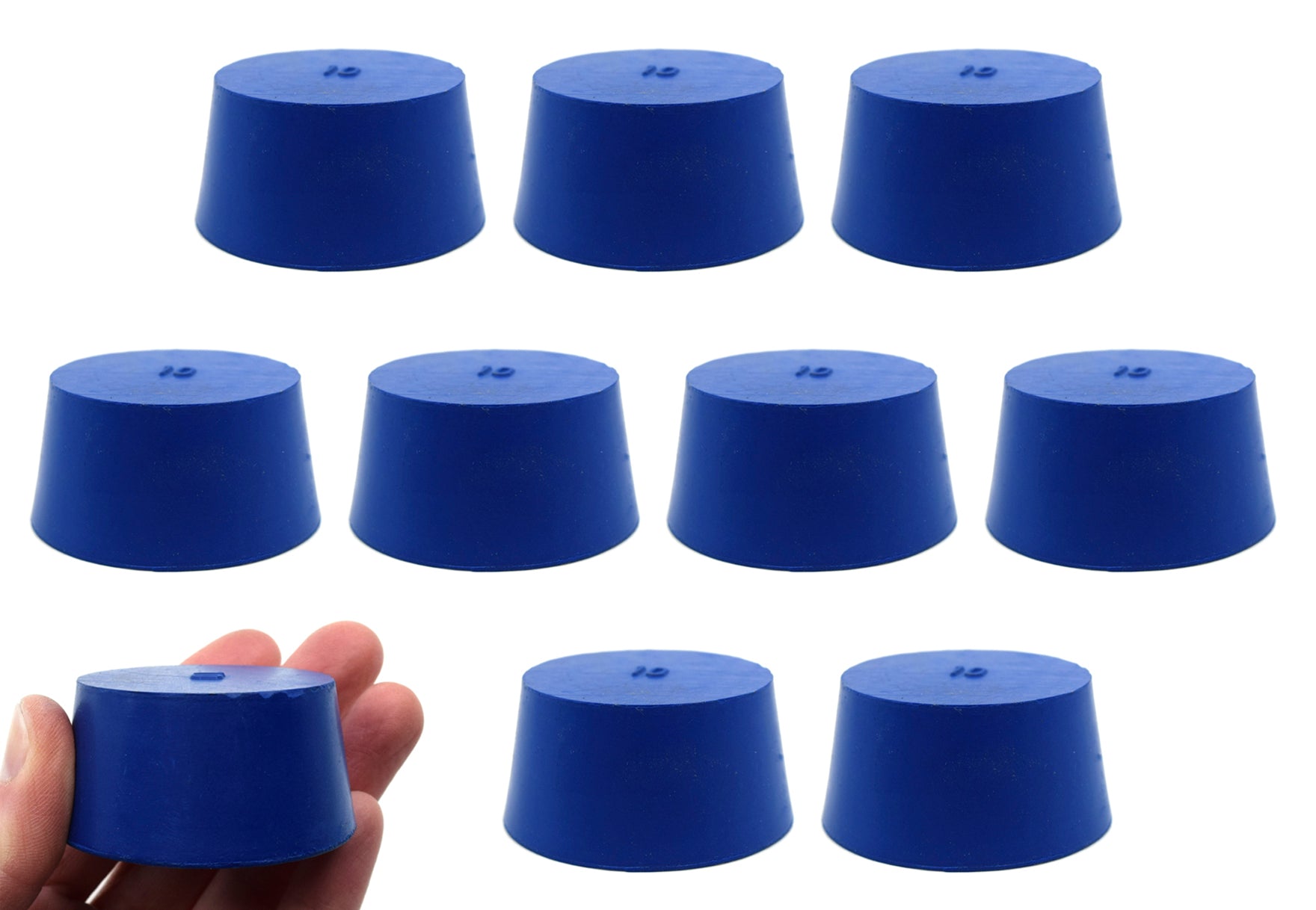 Pack of ten #10 stoppers made of solid, long lasting neoprene rubber. Blue color. Manufactured according to sizes recommended by ASTM standards. Each stopper measures 25mm in length, has a base diameter measuring 42mm, and a top diameter measuring 50mm. The neoprene rubber construction is suitable for use with petroleum products, minerals, oils and fats, as well as most inorganic acids and bases. Resistant to temperatures ranging from -40 to 130°C.