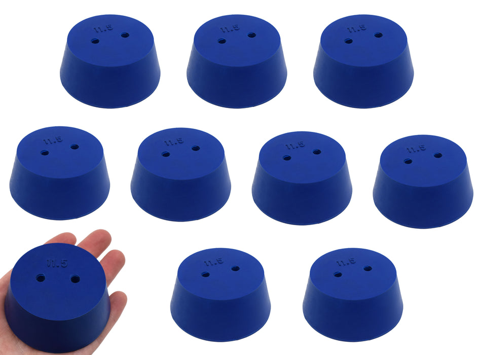 Pack of ten #11.5 stoppers made of long lasting neoprene rubber. Blue color. Each stopper features two holes measuring 5mm in diameter. Manufactured according to sizes recommended by ASTM standards. Each stopper measures 25mm in length, has a base diameter measuring 50mm, and a top diameter measuring 63mm. The neoprene rubber construction is suitable for use with petroleum products, minerals, oils and fats, as well as most inorganic acids and bases. Resistant to temperatures ranging from -40 to 130°C.