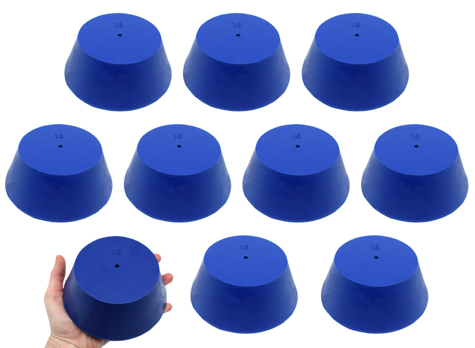 Pack of ten #16 stoppers made of long lasting neoprene rubber. Blue color. Each stopper features one hole measuring 5mm in diameter. Manufactured according to sizes recommended by ASTM standards. Each stopper measures 50mm in length, has a base diameter measuring 90mm, and a top diameter measuring 127mm. The neoprene rubber construction is suitable for use with petroleum products, minerals, oils and fats, as well as most inorganic acids and bases. Resistant to temperatures ranging from -40 to 130°C.