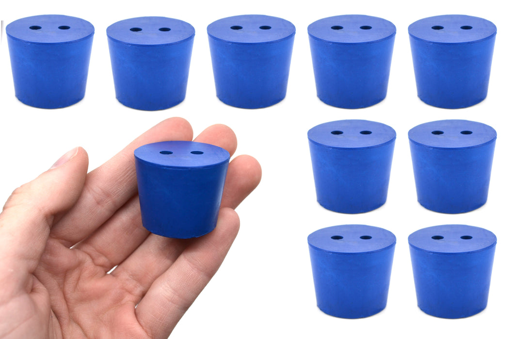 Pack of ten #6 stoppers made of long lasting neoprene rubber. Blue color. Each stopper features two holes measuring 5mm in diameter. Manufactured according to sizes recommended by ASTM standards. Each stopper measures 25mm in length, has a base diameter measuring 26mm, and a top diameter measuring 32mm. The neoprene rubber construction is suitable for use with petroleum products, minerals, oils and fats, as well as most inorganic acids and bases. Resistant to temperatures ranging from -40 to 130°C.