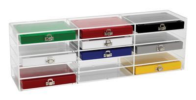 Storage Rack^ Storage Rack (15 bins) for 50-Place and 100-Place Slide Boxes, The clear acrylic construction allows you to see the Labels on the slide boxes.