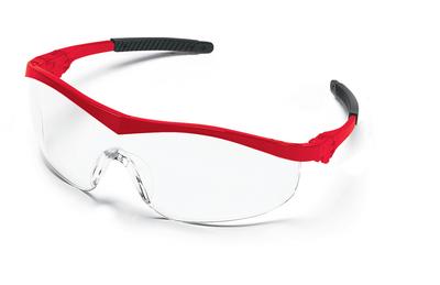 Safety Glasses^ Storm* safety glasses with red frames, clear lenses and ratchet temple.