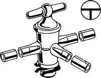 Stopcock, T-Bore, Glass Plug^ Bore: 2Mm; Plug Size: 12/30; Sidearm Od: 8Mm; Clip Size: #1. Stopcock Has Three Sidearms Sealed 90[Degree] Apart. The Solid Glass Plug Has A 'T' Shaped Bore So That Any Two Or All Three Sidearms Can Be Connected At One Time.