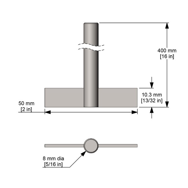 Electro-polished stainless-steel 316LWelded to shaftHigh shear with moderate vortexing characteristicsWill vortex 5 gallons of water at 1200rpm Shaft length, 16 in. (400mm); 5/16 in. diameter (8mm).Weight 0.3 lb. (136g)High speed; Low viscosity mixing; Radial flow pattern.