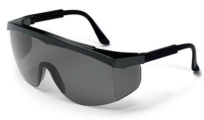 Safety Glasses^ Stratos* safety glasses, black frames with grey lenses.