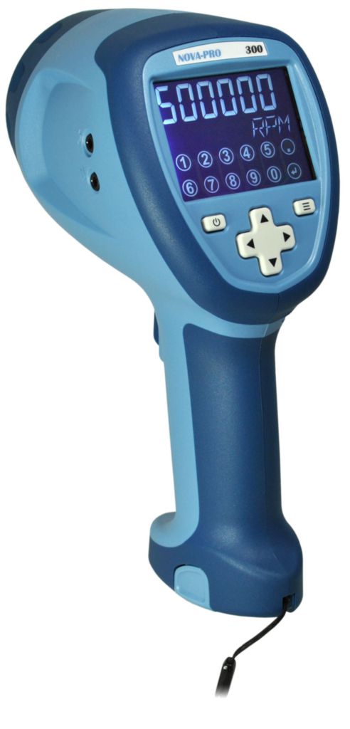 Nova-Pro 300 Stroboscope^ Nova-Pro 300 Stroboscope, Includes: integral laser module, standard Li-ion battery pk, battery charging station with interchangeable wall plug, operation manual/NIST certificate, Display: 6 Digit Numeric/5 Digit Alphanumeric LCD with touch pad, Tachometer Mode: 0-999,999RPM