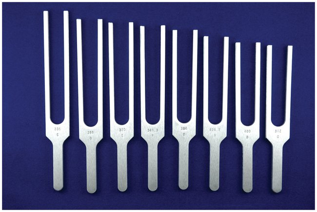 Eight-piece set includes forks with 256, 288, 320, 341.1, 384, 426.7, 480 and 512Hz 13-Piece set includes forks with 261.6, 277.1, 293.7, 311.1, 329.6, 349.2, 369.9, 392, 415.30, 440, 466.1, 493.9 and 523.2Hz