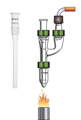 SUBLIMER COLD FINGER, MINUM-WARE^ The long cold finger is inserted thru a MW-20 claisen adapter and into a MW-54 thin wall reaction vial and then filled with ice water. A MW-32 thermometer adapter is then inserted into the other arm of the claisen adapter and conected to a vacuum source.