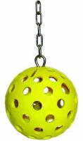 Super Challenger Ball^ 6in diameter, bright yellow color. CERTIFIED for use in most TOX Labs. Made of safe, 100% non-toxic, sturdy Polyethylene. Slot at the top allows treats to be easily inserted. 7in welded-link adjustable stainless steel suspension chain for attachment to the OUTSIDE of the cage.