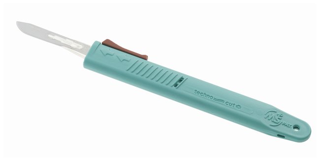 Top activated retractable safety scalpelAudible clicks indicate blade position (retracted, extended and final lock for disposal)With non-slip ribbed handle