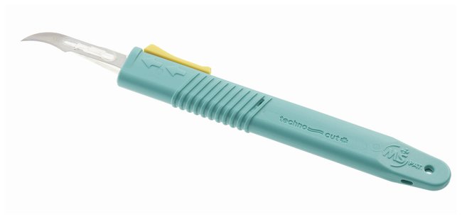 Top activated retractable safety scalpelAudible clicks indicate blade position (retracted, extended and final lock for disposal)With non-slip ribbed handle