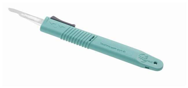 Top activated retractable safety scalpelAudible clicks indicate blade position (retracted, extended and final lock for disposal)With non-slip ribbed handle