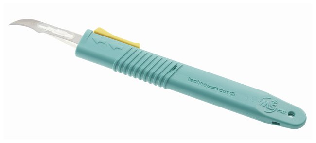 Top activated retractable safety scalpelAudible clicks indicate blade position (retracted, extended and final lock for disposal)With non-slip ribbed handle