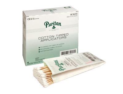 Puritan* Cotton-Tipped Applicators^ Disposable swabs have absorbent cotton tips and a wood shaft. Swabs may be autoclaved for sterile applications. Packed in bags of 100 applicators, 10 bags to a box, 10 boxes to a case. Head: 4.7Wx15.8Lmm. Handle: 2.0Wx152.4Lmm.