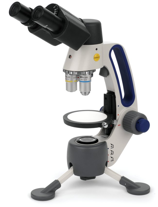 Allow viewing of both microscopic specimens, by using the compound objectives (4X, 10XD, and 40XRD), and macroscopic specimens, by using the 1X macro objective.Cordless, uses energy-efficient, rechargeable LED illuminationAllows up to 50 hours of use on a single 8-hour chargeMagnification range of 10X-400XW10XD, 18mm eyepieceBuilt-in NA 0.65 condenserAll-metal constructionSturdy detachable tripod legs fold for storage and stability on most indoor and outdoor surfacesMultiple stage positions allow for micro and macro viewingTop and bottom LED illumination provides energy-efficient white light with virtually no heatErgonomic carry handleStage clipsTop and bottom LED illumination provides energy-efficient white light with virtually no headDIN Achromatic 4X, 10XD, 40XRD objective for compound use (40X-400X magnification range)DIN Achromatic 1XRD for macro use (10X magnification)Classroom or field work applicationsWarranty and ServicesThree-year limited warranty