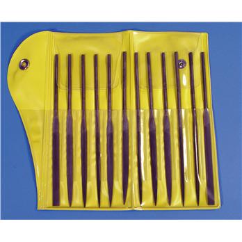 A 12-piece file set which contains the most popular shapes in a handy plastic pouch. Files come with knurled handles. Excellent quality. Available in cut #2 only. Length 5½ ".