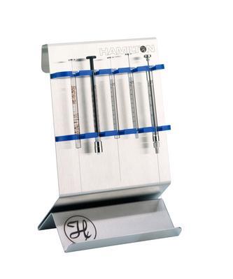 The Brushed Stainless Steel Syringe Rack^ Keeps your workplace tidy. store up to 5 syringes from the 700, 1700, or 7000 series. the plastic lip on the syringe rack is designed to keep your syringes from making contact with the rack, or other syringes, and to prevent sample contamination