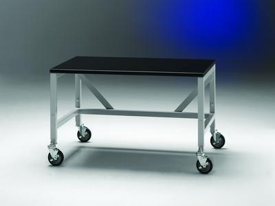 Equipment Table, Mobile, 4ft wide^ has 1.25in thick flat epoxy work surface. Height adjusts in 1in increments from 28.75 to 34.75. Constructed of 1in square epoxy-coated steel tubing mounted on 5in diameter toe locking casters. 800 lb. capacity.
