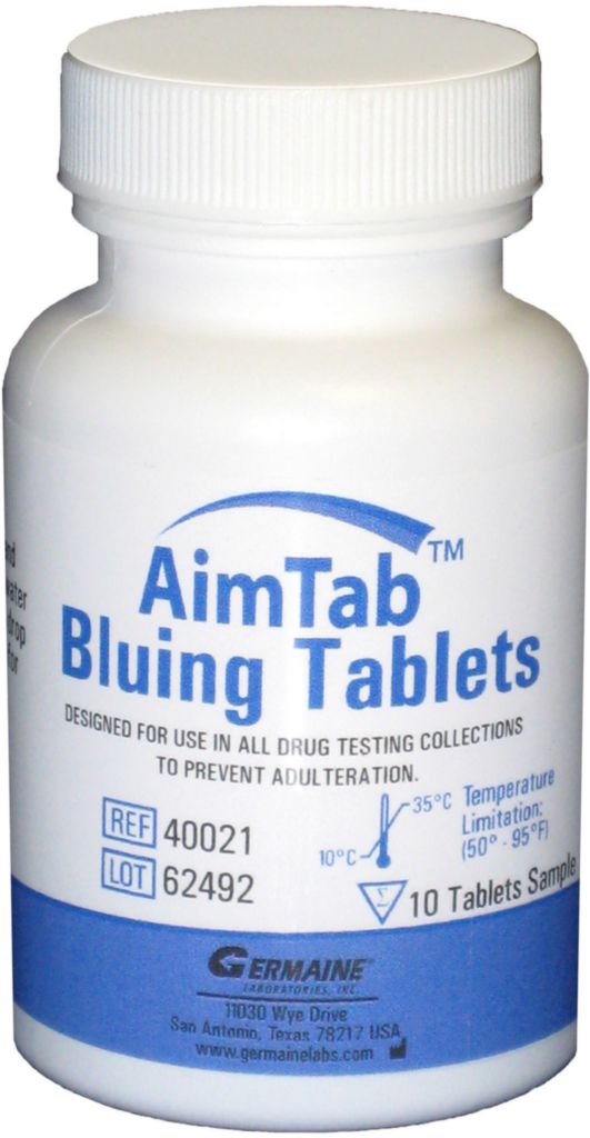 AimTab* Bluing Tablet^ AimTab* Bluing Tablet, Place tablet into toilet bowl before collection and turns water vibrant blue in less than a minute, Use one tablet per flush, Meets Federal DOT Regulation 49 CFR 40.41, Plumbers use for testing customers toilets for leaking flapper and ball valves