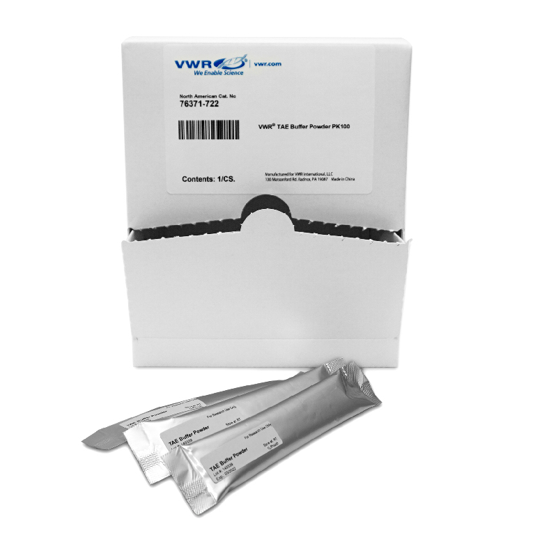 VWR® Buffer Powder Packs can save time and money, as there is no need to measure and weight many separate chemical components which is required when making buffers from scratch., VWR® Pre-measured buffer packs are extremely easy to use and are formulated so each pack makes 1 Liter of 1X buffer. Simply tear open a pack and mix completely with 1 liter of distilled water., 04_BodyText: Shipping costs are also minimal, as each case of 50 or 100 packs is compact and weighs only 2.5 Lbs., 02_BulletPoint: Buffer powder quickly dissolves to make 1L of 1X solution | No weighing or measuring of separate components | No pH adjustments required | Economical shipping, long shelf life | Quality and consistency guaranteed, 08_Certifications: COA avaialble for each lot number, 12_Packaging: Each case of buffer packs is packaged in a convenient dispenser box, which takes up very little lab space. Included in each case is an instruction insert, and a roll of stickers to label each container of prepared buffer solution., VWR® TAE Buffer Powder, Size: 100 pks, Cat. No.: 76371-722, pH: 8.2 - 8.5, Formulation: 40mM Tris, 20mM acetic acid, 1mM EDTA, VWR® Buffer Powder Packs can save time and money, as there is no need to measure and weight many separate chemical components which is required when making buffers from scratch., VWR® Pre-measured buffer packs are extremely easy to use and are formulated so each pack makes 1 Liter of 1X buffer. Simply tear open a pack and mix completely with 1 liter of distilled water., 04_BodyText: Shipping costs are also minimal, as each case of 50 or 100 packs is compact and weighs only 2.5 Lbs., 02_BulletPoint: Buffer powder quickly dissolves to make 1L of 1X solution | No weighing or measuring of separate components | No pH adjustments required | Economical shipping, long shelf life | Quality and consistency guaranteed, 08_Certifications: COA avaialble for each lot number, 12_Packaging: Each case of buffer packs is packaged in a convenient dispenser box, which takes up very little lab space. Included in each case is an instruction insert, and a roll of stickers to label each container of prepared buffer solution.