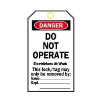 Lockout Tag^ Size: 14X7.6Cm. With 11.1Mm Brass Grommet. Polyester. Front Legend: "Danger Do Not Operate Electricians At Work ". Back Legend: "Danger This Energy Source Has Been Locked Out! Unauthorized Removal Of This Lock/Tag May Result In Immediate Discharge."