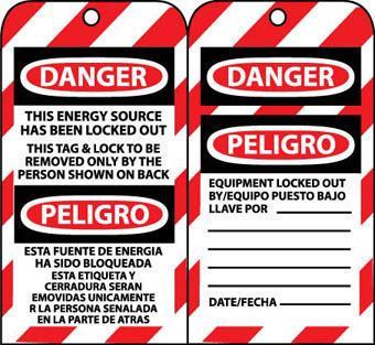 Tags, Lockout, Danger, This Energy Source Has Been Locked Out This Tag & Lock To Be Removed Only By The Person Shown On Back Bilingual, 6X3.25, Unrip Vinyl, 10 Pk^