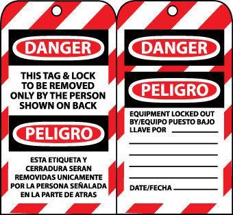 Tags, Lockout, Danger This Tag & Lock To Be Removed Only. . .(Bilingual), 6X3 1/4, Unrip Vinyl, 10/Pk^