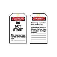 Lockout Tag^ Size: 14X7.6Cm. With 11.1Mm Brass Grommet. Heavy-Duty Polyester. Front Legend: "Danger Do Not Start This Lock/Tag May Only Be Removed By". Back Legend: "Danger This Energy Source Has Been Locked Out! Unauthorized Removal Of This Lock/Tag May Result In Immediate Discharge".