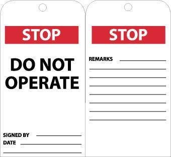 Tags, Stop Do Not Operate, 6X3.25, .015 Mil Unrip Vinyl 25 Pk^"