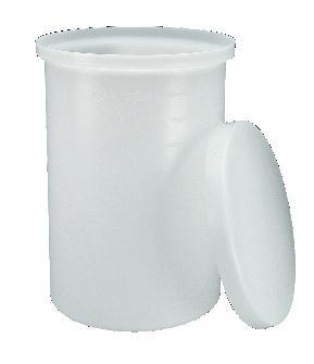 Cylindrical Tank, LLDPE, Lightweight^ 19L. External flange and overlapping skirted full-width cover. Graduated in liters and gallons. Good chemical resistance. Tolerant of temperature ranges. Not autoclavable. Plastic meets USP VI and FDA 21 CFR 177.1520. O.D.xDepth: 28x38cm.