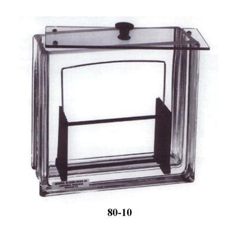 The single most useful chamber for the TLC laboratory is a sturdy, molded-glass block of clear glass with flat surface walls, ground lip of uniform flatness, beveled inside and outside to remove any sharp edges. There is a raised ridge midway on the inside ends and bottom of the jar. Inside dimensions measure 27cm D x 7cm W x 26cm H (10 5/8 x 2 7/8 x 10 ") and weighing 15 pounds. The lid is flat, weighing 1 pound and measures 30 x 10 x 3cm (11 3/4 x 3 7/8 x 3/16 "). Also available s a non-slip lid with Teflon® retainers inside and an external knob for easier lifting of the lid. Racks are 24 gauge stainless steel measuring 19cm W x 7cm D (7 1/2 x 2 3/4 ") weighing one pound. Another rack is aluminum multiplate and is hard anodized that measures 21cm W x 6cm D (8 1/4 x 2 1/2 ") also includes a stainless steel handle. (Jar alone will make an excellent museum, battery, or specimen jar.)