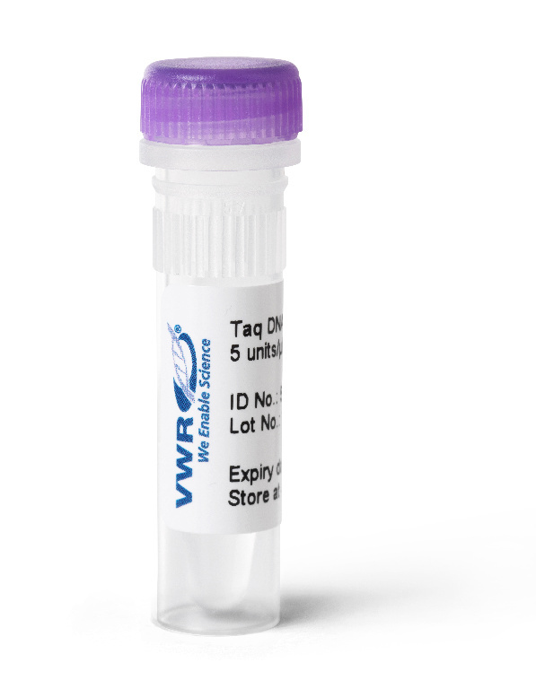 Concentration: 5 U/μl, VWR® Taq DNA polymerase is an ultra-pure, thermostable, recombinant DNA polymerase, which provides robust PCR performance in a wide range of PCR applications, without time-consuming optimization., Taq DNA polymerase concentration | : 5 Units/μl | 10X Key Buffe | r: Tris-HCl pH 8.5; (NH₄)₂SO₂, 15 mM MgCl₂, 1% Tween® 20 10X Extra Buffer | : Tris-HCl pH 8.3; KCl, 15 mM MgCl₂, 1% Tween®20 10X Key Buffer (Mg²⁺ free) | : Tris-HCl pH 8.5; (NH₄)₂SO₂, 1% Tween® 20 10X Extra Buffer (Mg²⁺ free) | : Tris-HCl pH 8.3; KCl, 1% Tween®20 | | Taq DNA polymerase is isolated from Thermus aquaticus, and has a molecular weight of approximately 94 kDa. VWR® Taq DNA Polymerase has both a 5' to 3' DNA polymerase and a double strand 5' to 3' exonuclease activity. The enzyme lacks a 3'→5' exonuclease activity (no proofreading ability). It leaves an A' overhang, which makes the enzyme ideal for TA cloning. Taq DNA polymerase is suitable for standard testing, routine PCR, screening and high-throughput testing. Long term storage at -20 °C. Product expiry at -20 °C is stated on the label. Optional: Store at 4 °C for up to 6 months., 04_BodyText: Additional MgCl₂ is included with each kit to enable optimization. Key Buffer (NH⁴⁺) gives a superior amplification signal (high yield) minimizing the need for optimization of the Mg²⁺ concentration or the annealing temperature in most primer-template systems. Extra Buffer is a traditional potassium (K⁺) buffer. Extra Buffer promotes high specificity, but careful optimization of primer annealing temperatures and Mg²⁺ concentrations may be required. Taq DNA polymerase is also available in a glycerol-free format for automation and lyophilization., 02_BulletPoint: A thermostable recombinant DNA polymerase | High product yield | dUTP incorporation possible | Processes up to 5 kb | Leaves a 3'dA overhang, 13_Caution: For Research Use Only. Not for use in diagnostic procedures., Taq DNA polymerase without 10X key buffer or 10X extra buffer, Size: 200,000 units, Cat. No.: 76620-424, Units: EA, Concentration: 5 U/μl, VWR® Taq DNA polymerase is an ultra-pure, thermostable, recombinant DNA polymerase, which provides robust PCR performance in a wide range of PCR applications, without time-consuming optimization., Taq DNA polymerase concentration | : 5 Units/μl | 10X Key Buffe | r: Tris-HCl pH 8.5; (NH₄)₂SO₂, 15 mM MgCl₂, 1% Tween® 20 10X Extra Buffer | : Tris-HCl pH 8.3; KCl, 15 mM MgCl₂, 1% Tween®20 10X Key Buffer (Mg²⁺ free) | : Tris-HCl pH 8.5; (NH₄)₂SO₂, 1% Tween® 20 10X Extra Buffer (Mg²⁺ free) | : Tris-HCl pH 8.3; KCl, 1% Tween®20 | | Taq DNA polymerase is isolated from Thermus aquaticus, and has a molecular weight of approximately 94 kDa. VWR® Taq DNA Polymerase has both a 5' to 3' DNA polymerase and a double strand 5' to 3' exonuclease activity. The enzyme lacks a 3'→5' exonuclease activity (no proofreading ability). It leaves an A' overhang, which makes the enzyme ideal for TA cloning. Taq DNA polymerase is suitable for standard testing, routine PCR, screening and high-throughput testing. Long term storage at -20 °C. Product expiry at -20 °C is stated on the label. Optional: Store at 4 °C for up to 6 months., 04_BodyText: Additional MgCl₂ is included with each kit to enable optimization. Key Buffer (NH⁴⁺) gives a superior amplification signal (high yield) minimizing the need for optimization of the Mg²⁺ concentration or the annealing temperature in most primer-template systems. Extra Buffer is a traditional potassium (K⁺) buffer. Extra Buffer promotes high specificity, but careful optimization of primer annealing temperatures and Mg²⁺ concentrations may be required. Taq DNA polymerase is also available in a glycerol-free format for automation and lyophilization., 02_BulletPoint: A thermostable recombinant DNA polymerase | High product yield | dUTP incorporation possible | Processes up to 5 kb | Leaves a 3'dA overhang, 13_Caution: For Research Use Only. Not for use in diagnostic procedures., Taq DNA polymerase with 10X key buffer (Mg²⁺ free), Size: 2500 units, Cat. No.: 76620-428, Units: EA, Concentration: 5 U/μl, VWR® Taq DNA polymerase is an ultra-pure, thermostable, recombinant DNA polymerase, which provides robust PCR performance in a wide range of PCR applications, without time-consuming optimization., Taq DNA polymerase concentration | : 5 Units/μl | 10X Key Buffe | r: Tris-HCl pH 8.5; (NH₄)₂SO₂, 15 mM MgCl₂, 1% Tween® 20 10X Extra Buffer | : Tris-HCl pH 8.3; KCl, 15 mM MgCl₂, 1% Tween®20 10X Key Buffer (Mg²⁺ free) | : Tris-HCl pH 8.5; (NH₄)₂SO₂, 1% Tween® 20 10X Extra Buffer (Mg²⁺ free) | : Tris-HCl pH 8.3; KCl, 1% Tween®20 | | Taq DNA polymerase is isolated from Thermus aquaticus, and has a molecular weight of approximately 94 kDa. VWR® Taq DNA Polymerase has both a 5' to 3' DNA polymerase and a double strand 5' to 3' exonuclease activity. The enzyme lacks a 3'→5' exonuclease activity (no proofreading ability). It leaves an A' overhang, which makes the enzyme ideal for TA cloning. Taq DNA polymerase is suitable for standard testing, routine PCR, screening and high-throughput testing. Long term storage at -20 °C. Product expiry at -20 °C is stated on the label. Optional: Store at 4 °C for up to 6 months., 04_BodyText: Additional MgCl₂ is included with each kit to enable optimization. Key Buffer (NH⁴⁺) gives a superior amplification signal (high yield) minimizing the need for optimization of the Mg²⁺ concentration or the annealing temperature in most primer-template systems. Extra Buffer is a traditional potassium (K⁺) buffer. Extra Buffer promotes high specificity, but careful optimization of primer annealing temperatures and Mg²⁺ concentrations may be required. Taq DNA polymerase is also available in a glycerol-free format for automation and lyophilization., 02_BulletPoint: A thermostable recombinant D
