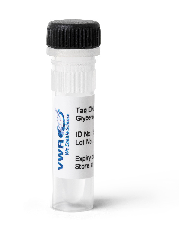 Concentration: 5 U/µl, VWR® Taq DNA Polymerase, glycerol-free, 5 U/µl is a thermostable recombinant DNA polymerase, which exhibits very high activity in primer extension and other molecular biology applications. The enzyme is isolated from Thermus aquaticus and has a molecular weight of approximately 94 kDa., Taq DNA Polymerase, glycerol-free, concentration | : 5 Units/μl Taq DNA Polymerase, glycerol-free, has both a 5'→3' DNA polymerase and a 5'→3' exonuclease activity. The enzyme lacks a 3'→5' exonuclease activity (no proofreading ability). VWR® Taq DNA Polymerase, glycerol-free, leaves an A' overhang, which makes the enzyme ideal for TA cloning. Long term storage at -20 °C. Product expiry at -20 °C is stated on the label. Optional: Store at 4 °C for up to 6 months., 02_BulletPoint: Glycerol-free storage buffer | Suitable for automated high-throughput testing | Ideal for freeze drying protocols | Suitable for robot-aided pipetting | Processes up to 5 kb | dUTP incorporation possible | Leaves a 3'dA overhang, 13_Caution: For Research Use Only. Not for use in diagnostic procedures., Taq DNA Polymerase, glycerol-free, Size: 100,000 unit, Cat. No.: 76620-418, Units: EA, Concentration: 5 U/µl, VWR® Taq DNA Polymerase, glycerol-free, 5 U/µl is a thermostable recombinant DNA polymerase, which exhibits very high activity in primer extension and other molecular biology applications. The enzyme is isolated from Thermus aquaticus and has a molecular weight of approximately 94 kDa., Taq DNA Polymerase, glycerol-free, concentration | : 5 Units/μl Taq DNA Polymerase, glycerol-free, has both a 5'→3' DNA polymerase and a 5'→3' exonuclease activity. The enzyme lacks a 3'→5' exonuclease activity (no proofreading ability). VWR® Taq DNA Polymerase, glycerol-free, leaves an A' overhang, which makes the enzyme ideal for TA cloning. Long term storage at -20 °C. Product expiry at -20 °C is stated on the label. Optional: Store at 4 °C for up to 6 months., 02_BulletPoint: Glycerol-free storage buffer | Suitable for automated high-throughput testing | Ideal for freeze drying protocols | Suitable for robot-aided pipetting | Processes up to 5 kb | dUTP incorporation possible | Leaves a 3'dA overhang, 13_Caution: For Research Use Only. Not for use in diagnostic procedures., Taq DNA Polymerase, glycerol-free, Size: 5000 units, Cat. No.: 76620-416, Units: EA, Concentration: 5 U/µl, VWR® Taq DNA Polymerase, glycerol-free, 5 U/µl is a thermostable recombinant DNA polymerase, which exhibits very high activity in primer extension and other molecular biology applications. The enzyme is isolated from Thermus aquaticus and has a molecular weight of approximately 94 kDa., Taq DNA Polymerase, glycerol-free, concentration | : 5 Units/μl Taq DNA Polymerase, glycerol-free, has both a 5'→3' DNA polymerase and a 5'→3' exonuclease activity. The enzyme lacks a 3'→5' exonuclease activity (no proofreading ability). VWR® Taq DNA Polymerase, glycerol-free, leaves an A' overhang, which makes the enzyme ideal for TA cloning. Long term storage at -20 °C. Product expiry at -20 °C is stated on the label. Optional: Store at 4 °C for up to 6 months., 02_BulletPoint: Glycerol-free storage buffer | Suitable for automated high-throughput testing | Ideal for freeze drying protocols | Suitable for robot-aided pipetting | Processes up to 5 kb | dUTP incorporation possible | Leaves a 3'dA overhang, 13_Caution: For Research Use Only. Not for use in diagnostic procedures., Taq DNA Polymerase, glycerol-free, with 10X Key Buffer and 10X Extra Buffer, Size: 1000 units, Cat. No.: 76620-422, Units: EA, Concentration: 5 U/µl, VWR® Taq DNA Polymerase, glycerol-free, 5 U/µl is a thermostable recombinant DNA polymerase, which exhibits very high activity in primer extension and other molecular biology applications. The enzyme is isolated from Thermus aquaticus and has a molecular weight of approximately 94 kDa., Taq DNA Polymerase, glycerol-free, concentration | : 5 Units/μl Taq DNA Polymerase, glycerol-free, has both a 5'→3' DNA polymerase and a 5'→3' exonuclease activity. The enzyme lacks a 3'→5' exonuclease activity (no proofreading ability). VWR® Taq DNA Polymerase, glycerol-free, leaves an A' overhang, which makes the enzyme ideal for TA cloning. Long term storage at -20 °C. Product expiry at -20 °C is stated on the label. Optional: Store at 4 °C for up to 6 months., 02_BulletPoint: Glycerol-free storage buffer | Suitable for automated high-throughput testing | Ideal for freeze drying protocols | Suitable for robot-aided pipetting | Processes up to 5 kb | dUTP incorporation possible | Leaves a 3'dA overhang, 13_Caution: For Research Use Only. Not for use in diagnostic procedures., Taq DNA Polymerase, glycerol-free, Size: 200,000 units, Cat. No.: 76620-420, Units: EA, VWR® Taq DNA Polymerase, glycerol-free, 5 U/µl is a thermostable recombinant DNA polymerase, which exhibits very high activity in primer extension and other molecular biology applications. The enzyme is isolated from Thermus aquaticus and has a molecular weight of approximately 94 kDa., Taq DNA Polymerase, glycerol-free, concentration | : 5 Units/μl Taq DNA Polymerase, glycerol-free, has both a 5'→3' DNA polymerase and a 5'→3' exonuclease activity. The enzyme lacks a 3'→5' exonuclease activity (no proofreading ability). VWR® Taq DNA Polymerase, glycerol-free, leaves an A' overhang, which makes the enzyme ideal for TA cloning. Long term storage at -20 °C. Product expiry at -20 °C is stated on the label. Optional: Store at 4 °C for up to 6 months., 02_BulletPoint: Glycerol-free storage buffer | Suitable for automated high-throughput testing | Ideal for freeze drying protocols | Suitable for robot-aided pipetting | Processes up to 5 kb | dUTP incorporation possible | Leaves a 3'dA overhang, 13_Caution: For Research Use Only. Not for use in diagnostic procedures.