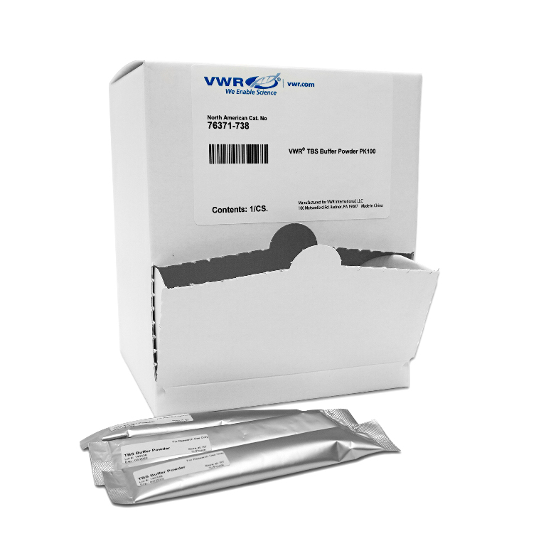VWR® Buffer Powder Packs can save time and money, as there is no need to measure and weight many separate chemical components which is required when making buffers from scratch., VWR® Pre-measured buffer packs are extremely easy to use and are formulated so each pack makes 1 Liter of 1X buffer. Simply tear open a pack and mix completely with 1 liter of distilled water., 04_BodyText: Shipping costs are also minimal, as each case of 50 or 100 packs is compact and weighs only 2.5 Lbs., 02_BulletPoint: Buffer powder quickly dissolves to make 1L of 1X solution | No weighing or measuring of separate components | No pH adjustments required | Economical shipping, long shelf life | Quality and consistency guaranteed, 08_Certifications: COA avaialble for each lot number, 12_Packaging: Each case of buffer packs is packaged in a convenient dispenser box, which takes up very little lab space. Included in each case is an instruction insert, and a roll of stickers to label each container of prepared buffer solution., Final SAP Desc Link: 17076431, SAP Description Status: Ready, VWR® Buffer Powder Packs can save time and money, as there is no need to measure and weight many separate chemical components which is required when making buffers from scratch., VWR® Pre-measured buffer packs are extremely easy to use and are formulated so each pack makes 1 Liter of 1X buffer. Simply tear open a pack and mix completely with 1 liter of distilled water., 04_BodyText: Shipping costs are also minimal, as each case of 50 or 100 packs is compact and weighs only 2.5 Lbs., 02_BulletPoint: Buffer powder quickly dissolves to make 1L of 1X solution | No weighing or measuring of separate components | No pH adjustments required | Economical shipping, long shelf life | Quality and consistency guaranteed, 08_Certifications: COA avaialble for each lot number, 12_Packaging: Each case of buffer packs is packaged in a convenient dispenser box, which takes up very little lab space. Included in each case is an instruction insert, and a roll of stickers to label each container of prepared buffer solution., VWR® TBS Buffer Powder, Size: 100 pks, Cat. No.: 76371-738, pH: 7.25 - 7.55, Formulation: 137 mM NaCl, 2.7 mM KCl, 50 mM Tris, Final SAP Desc Link: 17076431, SAP Description Status: Ready