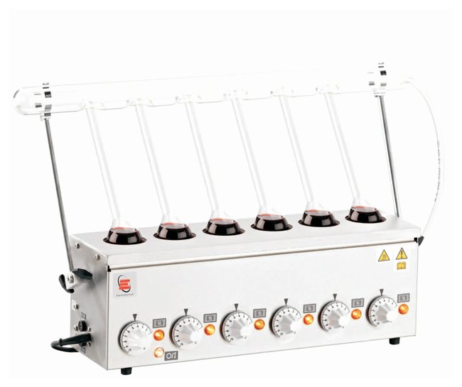 Rugged, easy to clean stainless steel constructionBack-mounted brackets hold flask support rods (supplied with each unit)Six positions which can accommodate flasks of between 18mL to 50mL capacityDedicated controllers for each recess are housed in a “cool zone”Grounded stainless steel earth screen covering heating elementUnits are double fused for added safetyWith On/Off switch, “Mains to Heater” amber neon indicator and “Mains On” clear neon indicatorTemperature range: 550°C to 800°C maximum