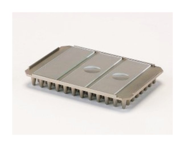 Accommodates up to 4 standard size microscope slides with thermal transfer effectiveness similar to that of PCR plateMade of single piece of machined aluminium Regular cleaning can be done with water and mild laboratory cleaning detergentsDesign allows easy removal of glass slides via corner cut-outsAluminium perimeter ridge allows thermal cycler lid to be closed without risking damage to glass slides and PCR samplesCompatible with 96 x 0.2mL thermal cyclerSpecifications:Sample capacity: 4 glass slides 75 x 25mm (3 x 1 in.)Temperature range: 0° to 100°CD x W x H: 80 x 115 x 16mmAdapter accuracy at 55°C: ±0.2°CAdapter uniformity at 55°C: ±0.25°CWeight: 150gWarranty and Services2 year
