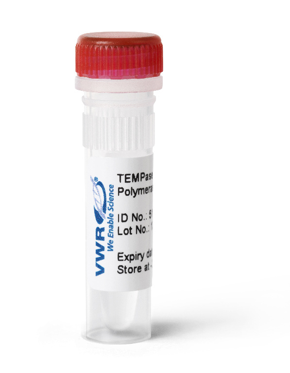 Concentration: 5 U/µl, TEMPase Hot Start DNA Polymerase is a chemically modified version of VWR® Taq DNA Polymerase and is activated by 15 minutes of heat treatment., TEMPase Hot Start DNA Polymerase concentration | : 5 Units/μl TEMPase Hot Start DNA Polymerase is suitable for detection of low abundance targets, screening, multiplexing, direct colony PCR and real-time PCR applications TEMPase Hot Start DNA Polymerase has been designed to diminish the formation of non-specific priming events during reaction set-up and the first ramp of thermal cycling. Chemical inactivation of TEMPase Hot Start DNA Polymerase has proven highly effective compared to other inactivation methods such as antibody inactivation. The chemically modified enzyme withstands longer periods of time at room temperature without non-specific PCR amplifications. This feature is useful if you need pre-incubation at elevated temperatures, for example in case of UNG treatment at 50 °C prior to PCR. TEMPase Hot Start DNA polymerase is also available in a glycerol-free format for automation and lyophilization. Long term storage at -20 °C. Product expiry at -20 °C is stated on the label. Optional: Store at 4 °C for up to 6 months. TEMPase Hot Start DNA Polymerase is usually supplied in kits with Key Buffer and Combination Buffer. 10X Key Buffer promotes high specificity over a broad range of annealing temperatures and Mg2 concentrations. The Key Buffer also works well when dealing with difficult templates, e.g. GC-rich DNA sequences. 10X Combination Buffer is a balanced ammonium-potassium PCR buffer. Combination Buffer results in tolerance towards optimization of primer annealing temperatures and Mg2 concentrations. Additional MgCl₂ is included with each kit to enable optimization., 02_BulletPoint: Reaction set-up at room temperature | dUTP incorporation possible | Increased sensitivity, specificity and product yield | Detection of low abundance targets | Processes up to 4 kb, 13_Caution: For Research Use Only. Not for use in diagnostic procedures., Tempase Hot Start DNA Polymerase with 10X Key Buffer and 10X Combination Buffer, Size: 10000 units, Cat. No.: 76620-498, Units: EA, Concentration: 5 U/µl, TEMPase Hot Start DNA Polymerase is a chemically modified version of VWR® Taq DNA Polymerase and is activated by 15 minutes of heat treatment., TEMPase Hot Start DNA Polymerase concentration | : 5 Units/μl TEMPase Hot Start DNA Polymerase is suitable for detection of low abundance targets, screening, multiplexing, direct colony PCR and real-time PCR applications TEMPase Hot Start DNA Polymerase has been designed to diminish the formation of non-specific priming events during reaction set-up and the first ramp of thermal cycling. Chemical inactivation of TEMPase Hot Start DNA Polymerase has proven highly effective compared to other inactivation methods such as antibody inactivation. The chemically modified enzyme withstands longer periods of time at room temperature without non-specific PCR amplifications. This feature is useful if you need pre-incubation at elevated temperatures, for example in case of UNG treatment at 50 °C prior to PCR. TEMPase Hot Start DNA polymerase is also available in a glycerol-free format for automation and lyophilization. Long term storage at -20 °C. Product expiry at -20 °C is stated on the label. Optional: Store at 4 °C for up to 6 months. TEMPase Hot Start DNA Polymerase is usually supplied in kits with Key Buffer and Combination Buffer. 10X Key Buffer promotes high specificity over a broad range of annealing temperatures and Mg2 concentrations. The Key Buffer also works well when dealing with difficult templates, e.g. GC-rich DNA sequences. 10X Combination Buffer is a balanced ammonium-potassium PCR buffer. Combination Buffer results in tolerance towards optimization of primer annealing temperatures and Mg2 concentrations. Additional MgCl₂ is included with each kit to enable optimization., 02_BulletPoint: Reaction set-up at room temperature | dUTP incorporation possible | Increased sensitivity, specificity and product yield | Detection of low abundance targets | Processes up to 4 kb, 13_Caution: For Research Use Only. Not for use in diagnostic procedures., Tempase Hot Start DNA Polymerase with 10X Key Buffer and 10X Combination Buffer, Size: 500 units, Cat. No.: 76620-494, Units: EA, Concentration: 5 U/µl, TEMPase Hot Start DNA Polymerase is a chemically modified version of VWR® Taq DNA Polymerase and is activated by 15 minutes of heat treatment., TEMPase Hot Start DNA Polymerase concentration | : 5 Units/μl TEMPase Hot Start DNA Polymerase is suitable for detection of low abundance targets, screening, multiplexing, direct colony PCR and real-time PCR applications TEMPase Hot Start DNA Polymerase has been designed to diminish the formation of non-specific priming events during reaction set-up and the first ramp of thermal cycling. Chemical inactivation of TEMPase Hot Start DNA Polymerase has proven highly effective compared to other inactivation methods such as antibody inactivation. The chemically modified enzyme withstands longer periods of time at room temperature without non-specific PCR amplifications. This feature is useful if you need pre-incubation at elevated temperatures, for example in case of UNG treatment at 50 °C prior to PCR. TEMPase Hot Start DNA polymerase is also available in a glycerol-free format for automation and lyophilization. Long term storage at -20 °C. Product expiry at -20 °C is stated on the label. Optional: Store at 4 °C for up to 6 months. TEMPase Hot Start DNA Polymerase is usually supplied in kits with Key Buffer and Combination Buffer. 10X Key Buffer promotes high specificity over a broad range of annealing temperatures and Mg2 concentrations. The Key Buffer also works well when dealing with difficult templates, e.g. GC-rich DNA sequences. 10X Combination Buffer is a balanced ammonium-potassium PCR buffer. Combination Buffer results in tolera